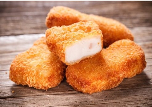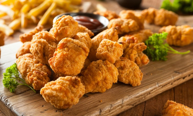 Julienned chicken pieces, french fries, yoghurt sauce, fresh thyme, creamy mushroom penne pasta and salad